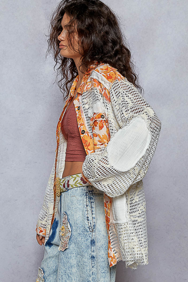 A bold fusion of texture and print, this statement overshirt blends airy open-weave mesh with vibrant orange floral panels for a striking, layered look. Designed with a relaxed, slightly oversized fit, it features a classic collar, button-front closure, and dual chest pockets accented in warm sunset hues. Frayed edges and mixed-fabric detailing add artisanal charm, while the lightweight construction makes it perfect for layering over bralettes, tanks, or fitted tops. Effortlessly bohemian with a modern edge, this piece brings color and character to any casual ensemble.